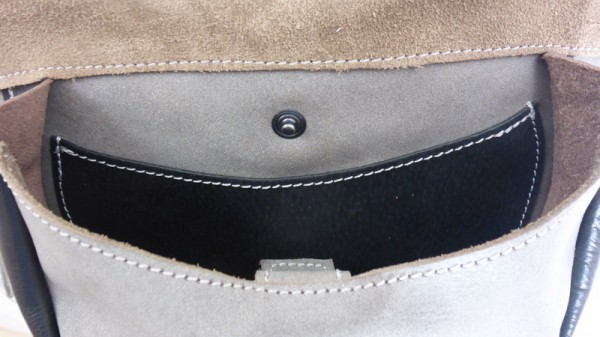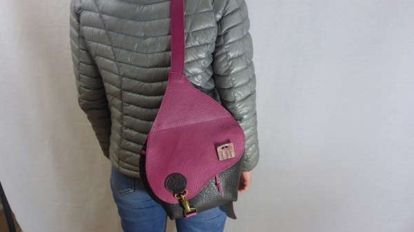 Sac multi positions, idéal pour la femme active, devant, derrière, sur le coté, il ne tombe jamais de votre épaule, sur le rabat décoration en céramique raku, poche plaquée à l’intérieur en cuir, bandoulière réglable.