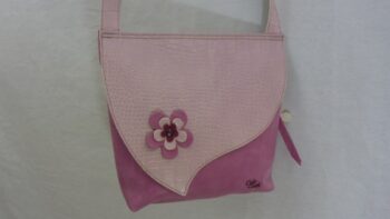 Sac portage à l’épaule ou en porté croisé, sur le rabat décoration fleur en cuir, poche principale fermée par fermeture éclair, poche plaquée à l’ intérieur du sac, poche plaquée à l’arrière du sac fermée par fermeture éclair, bandoulière réglable.